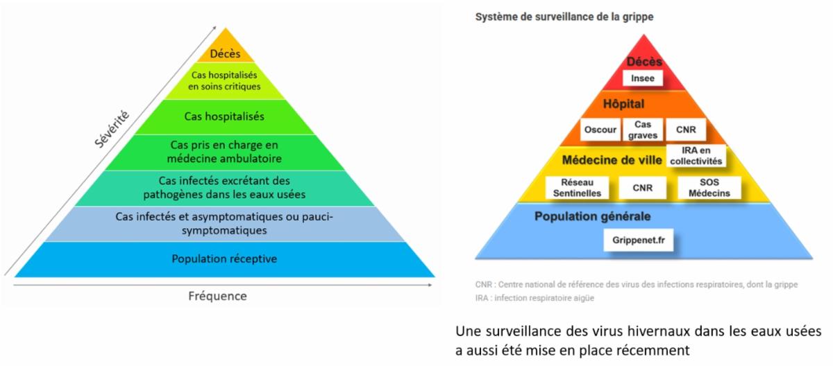 Pour les maladies infectieuses, on parle d’une "pyramide de la surveillance", échelonnée selon la fréquence et la gravité des indicateurs collectés auprès de différents interlocuteurs.