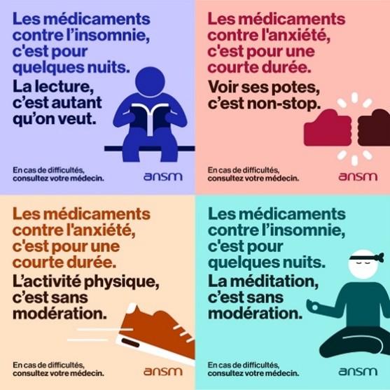 | | "Les médicaments et moi" : campagne de l'ANSM sur le bon usage des médicaments dans le traitement de l'anxiété et de l'insomnie. | L'ANSM a lancé une campagne plutôt percutante pour sensibiliser au bon usage des médicaments dans le traitement de l’anxiété et de l’insomnie. L’un de nos précédents bulletins, précurseur, vous avait proposé un dossier sur ce thème. Les outils de la campagne en cours de l’ANSM complètent la liste de ceux que nous vous avions proposés : affiches ludiques, dépliants et vidéos pour les patients, dépliants et tableaux de synthèse pour les professionnels de santé. A consommer sans modération. | | |