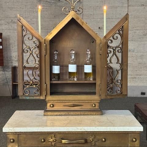 The Ambry. How many times have you walked by this? It contains the three sacred oils: Sacred Chrism, Oil of Catechumens, and Oil of the Sick.