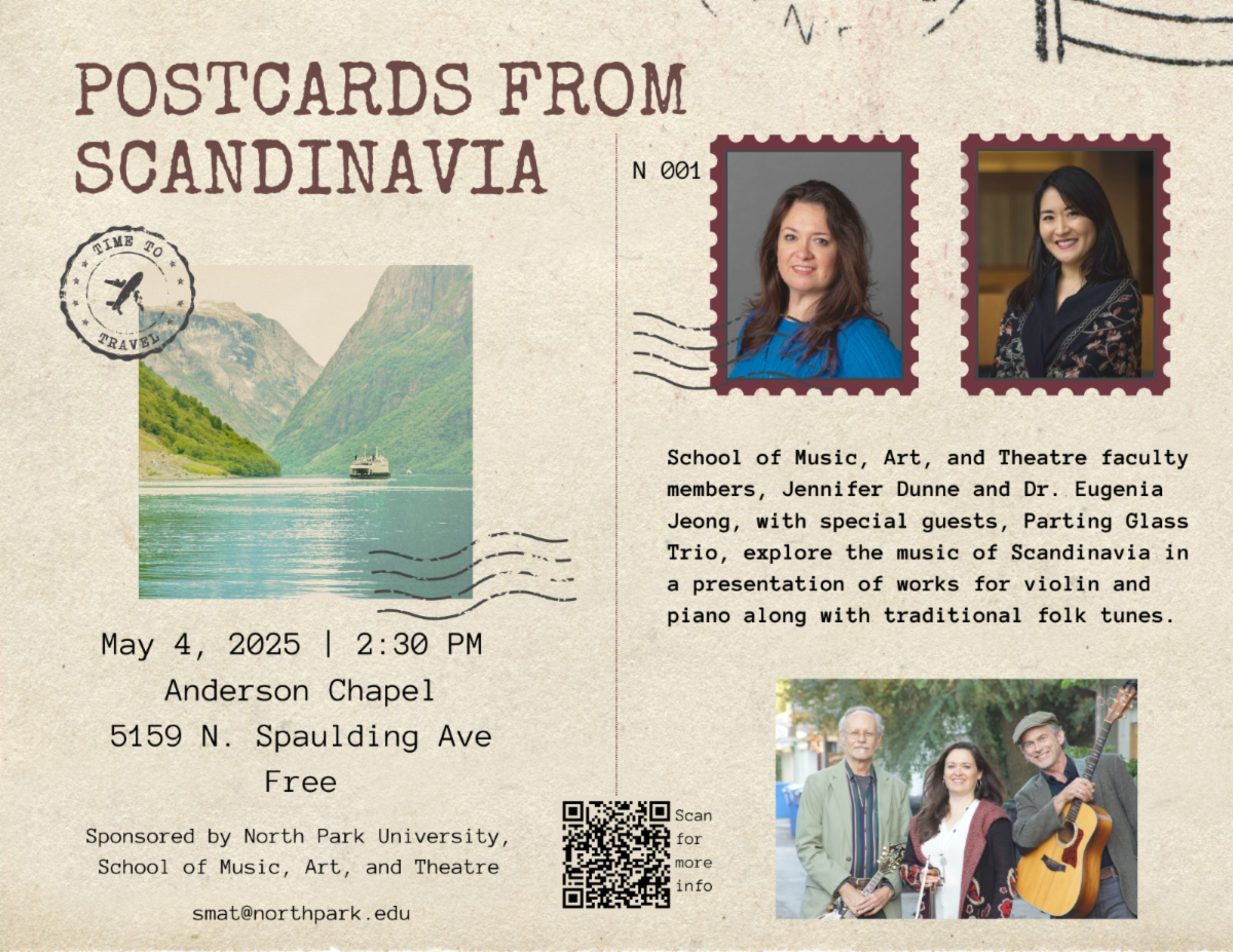 School of Music, Art, and Theatre faculty members Jennifer Dunne and Dr. Eugenia Jeong explore the folk music of Scandinavia in a free presentation of works for violin and piano by Edvard Grieg and Johan Svendsen. The event will take place at 2:30 pm in Anderson Chapel, 5159 N. Spaulding Ave.