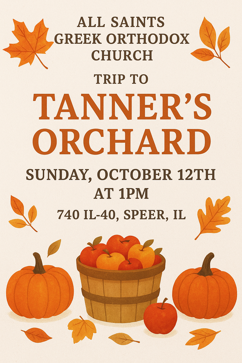 We will be taking a trip to Tanner’s Orchard in Speer, IL on Sunday October 12th at 1pm. There will be apple picking, a petting zoo, and a large space for the kids to play. There is also a store and cafe. Come and enjoy a fun time with our parish family!