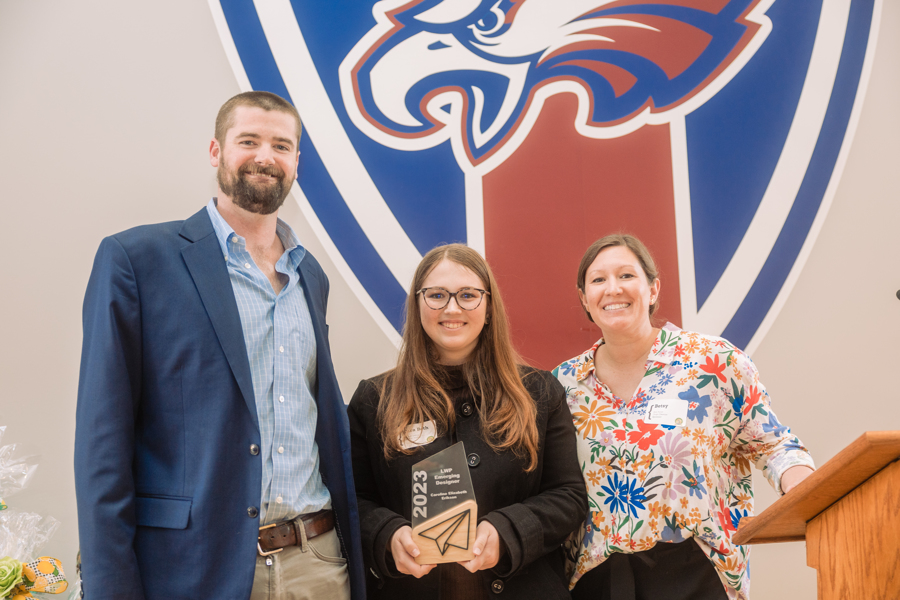 Cara Beth Erickson, a rising senior at East Wake Academy, was awarded the LWP Emerging Designer Scholarship presented by Design Dimension, Inc. Betsy Rascoe, President, and Hunter Rascoe, VP, of Design Dimension, Inc. are pictured here with Ms. Erickson. The scholarship provides full tuition for Ms. Erickson to attend the High School Explorations Residential Design Camp at NC State.