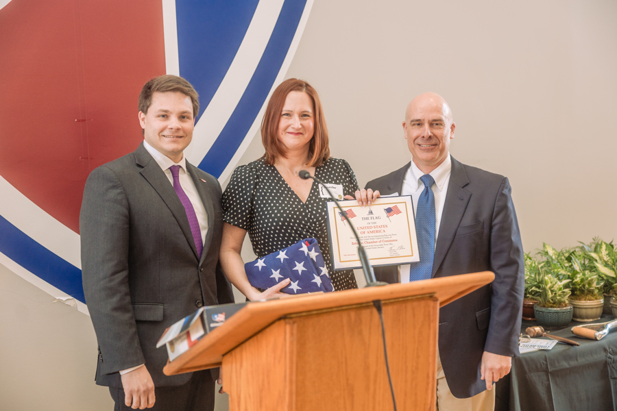 In commemoration of Zebulon Chamber's 75th anniversary, Trey Lewis, Northeast Regional Representative from the Office of Sen. Thom Tillis presented an American flag that flew over the Capitol in Washington, DC., on the Senator's behalf. Receiving the flag were Jennifer Williams, Chamber Board Chair, and John Saffold, Executive Director.