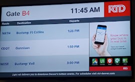 According to a media report, Greyhound may need to find an alternative to the bus concourse in Denver Union Station for its Mile High City service due to capacity demands and social issues. Bustang has begun using a new “Mobility Hub” on I-25 near Longmont and Loveland. The center-loading hub allows buses to make stops without time-consuming diversions from the expressway and is designed to reduce traffic congestion and pollution. It was installed as part of the I-25 North Express Lanes Project. (Caption: Departure board at Denver Union Station)
