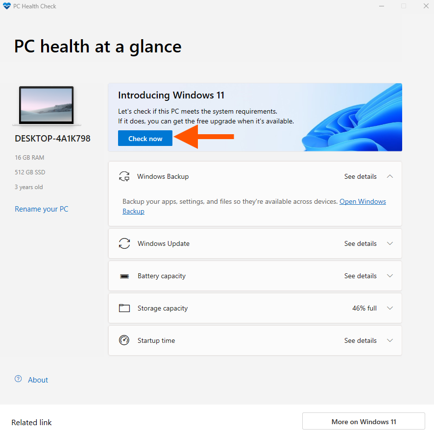 3) Click [Check Now] as shown in reference image seen above in this article. You will now be presented with an evaluation of your laptop if it is OK to migrate to Windows 11.