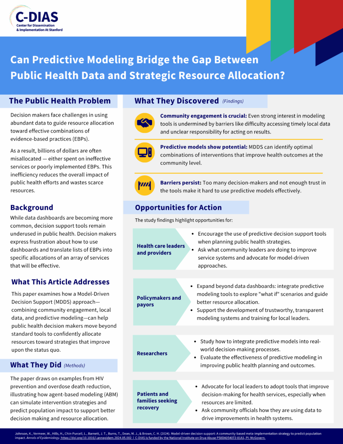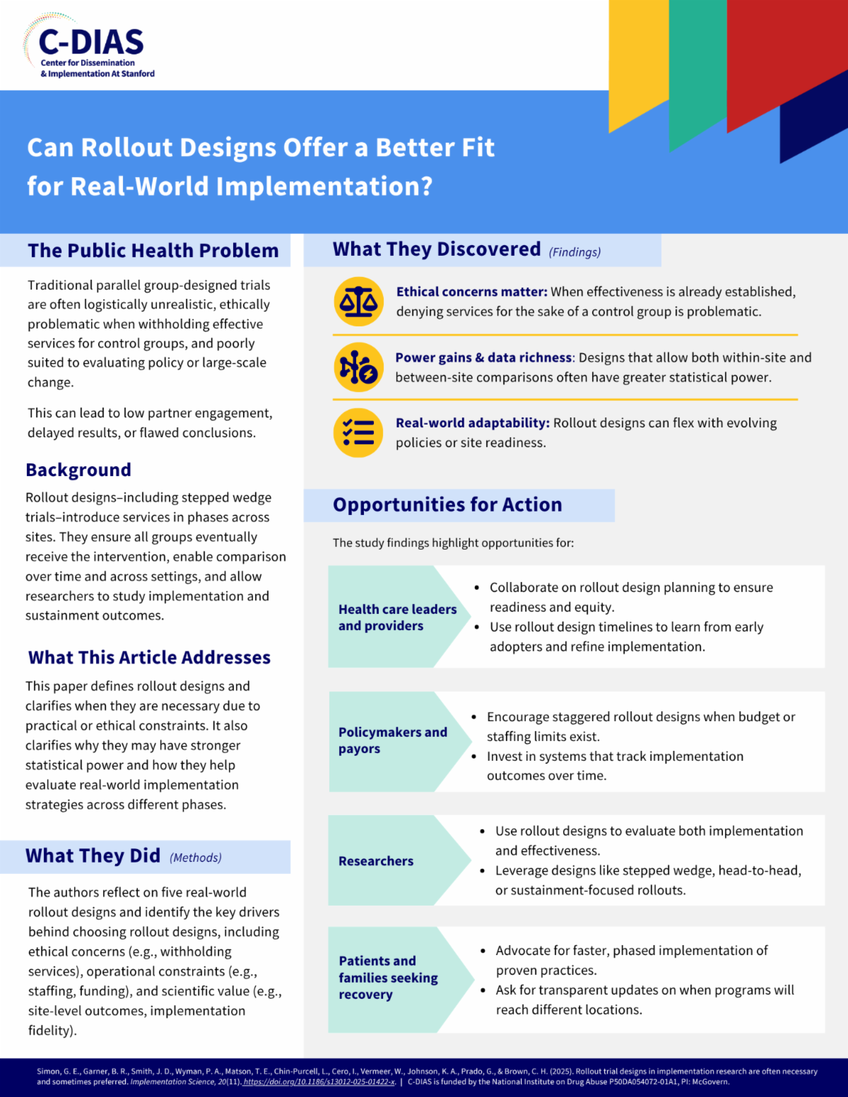 One of the more exciting and innovative developments is our effort to pool together data and findings across projects. The fields of addiction research and implementation science have been compromised in impact in part because of the lack of standardized measures. This makes it challenging if not impossible to replicate or pool findings across studies toward generalizable knowledge. This severely limits the impact of research projects beyond one-shot research studies. Led by Hendricks Brown and Jane Kim, a focused team is striving to harmonize quantitative data from measures across the C-DIAS and related research projects. In parallel, C-DIAS administrative core teams are working to harmonize qualitative data from the projects using both traditional and large language model (LLM) AI techniques. Ironically, implementation science has suffered a translational problem—particularly in the overuse of theories, models and frameworks, as well as obfuscating language and acronyms. In our “market research” this feedback is loud and consistent. We have and will continue to communicate and leverage our work by designing pragmatic tools and translating complex findings for broader audiences. Everyday people who want to use implementation science to solve health care delivery problems should be able to do so.