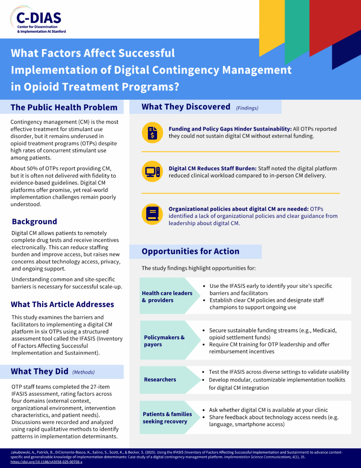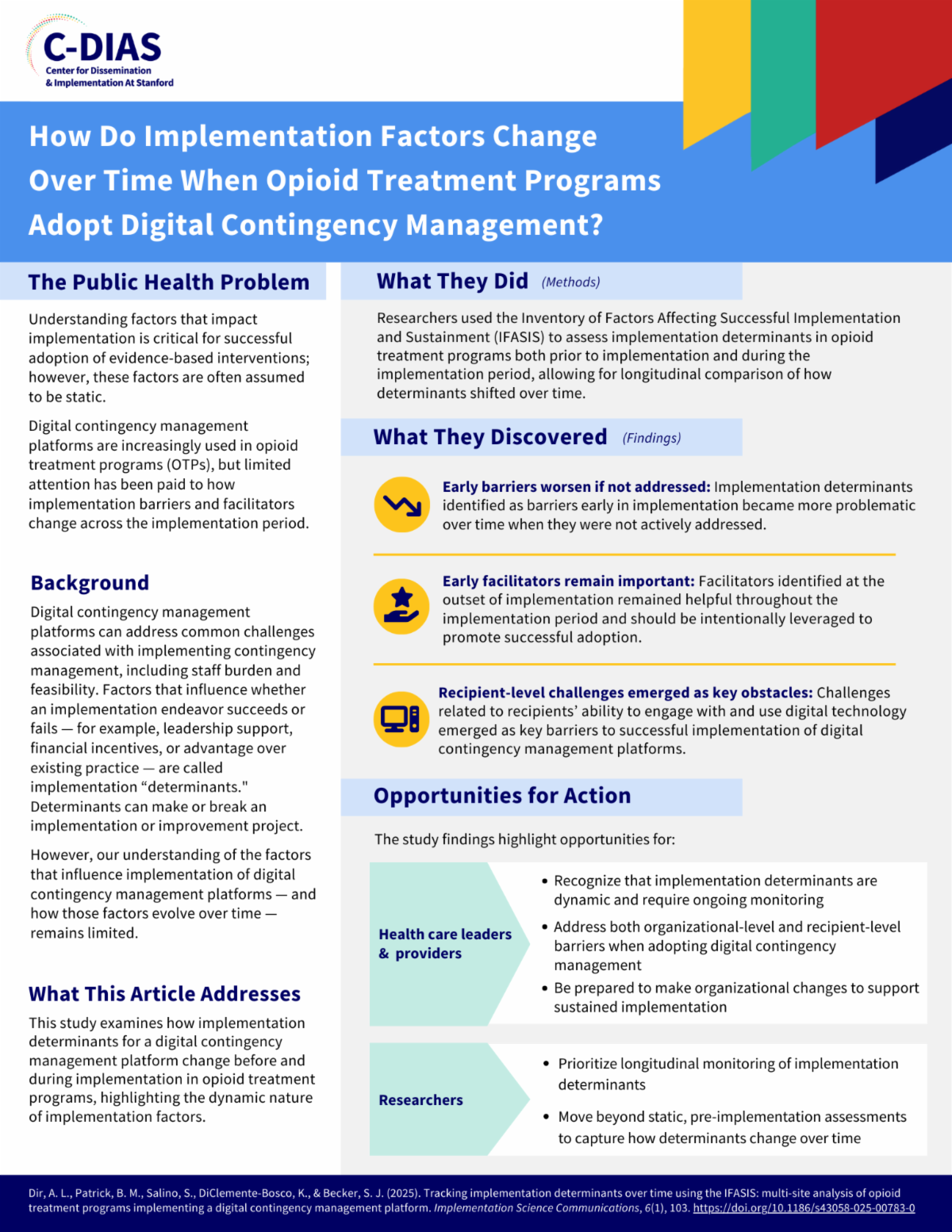 - Tracking implementation determinants over time using the IFASIS: multi-site analysis of opioid treatment programs implementing a digital contingency management platform. Implementation Science Communications, 6(1), 103. https://doi.org/10.1186/s43058-025-00783-0