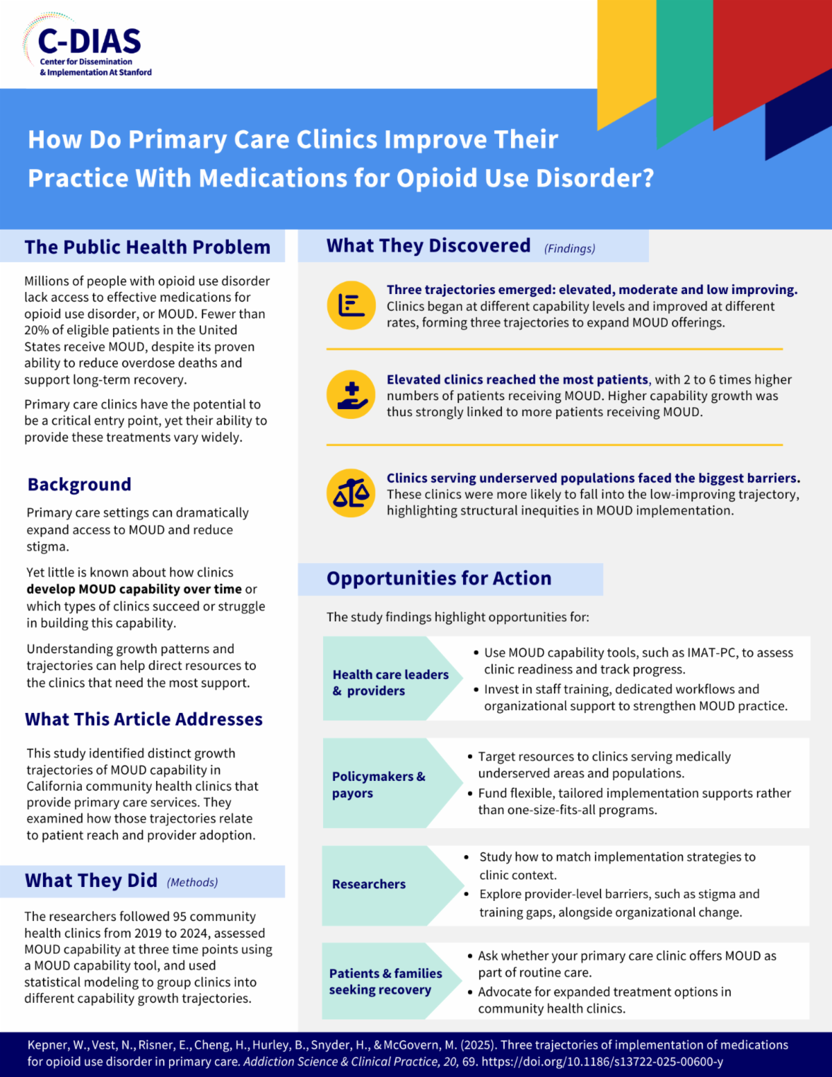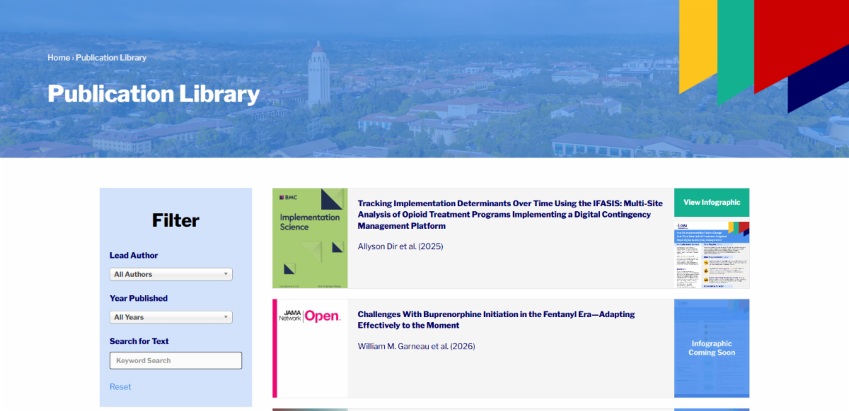 The C-DIAS Publication Library serves as a central hub for the center’s published research and visual resources on implementation science. It brings together peer-reviewed articles and infographics developed by C-DIAS faculty, fellows, and collaborators, making it easier to explore and share work focused on implementing evidence-based practices in addiction care.