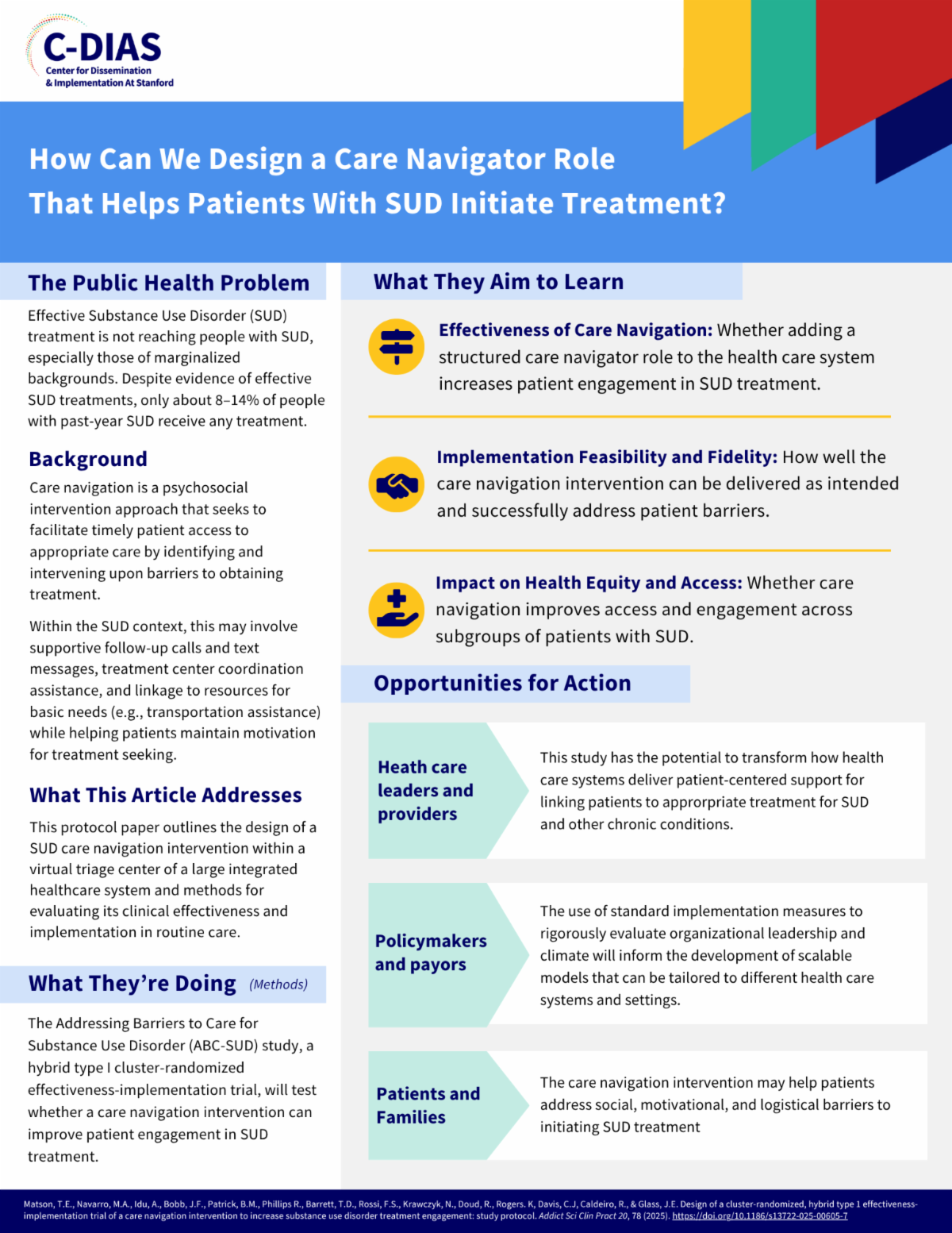 Design of a cluster-randomized, hybrid type 1 effectiveness-implementation trial of a care navigation intervention to increase substance use disorder treatment engagement: study protocol. Addiction Science & Clinical Practice 20, 78 (2025). https://doi.org/10.1186/s13722-025-00605-7