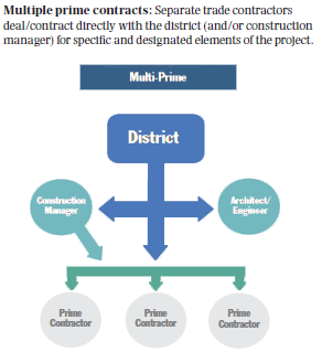 In Part 1, the Construction Management Multi-Prime (CMMP) delivery method was discussed. As depicted below, the district manages the construction project by awarding contracts to selected prime contractors. Using this method, the district assumes more risks, including the burden of processing each contract and billing.