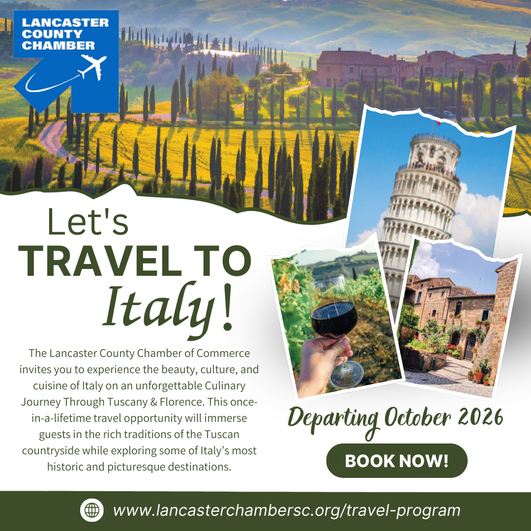 The Chamber is excited to announce its 2nd group travel opportunity for 2026 as a part of our Travel Program—this time, a highly anticipated fall getaway after strong interest and requests from the community. Partnering once again with Premier World Discovery’s Chamber Explorations, this trip promises a seamless, enriching journey with expertly planned itineraries, guided tours, and memorable cultural experiences. The October 2026 trip will feature a Culinary Journey through Tuscany and Florence, including five nights in the scenic Tuscan countryside and two nights in the historic city of Florence. Travelers can look forward to authentic Italian cuisine, vineyard visits, breathtaking landscapes, and immersive cultural excursions. With demand already high for fall travel, the Chamber encourages interested participants to learn more and secure their spot early for this unforgettable experience.