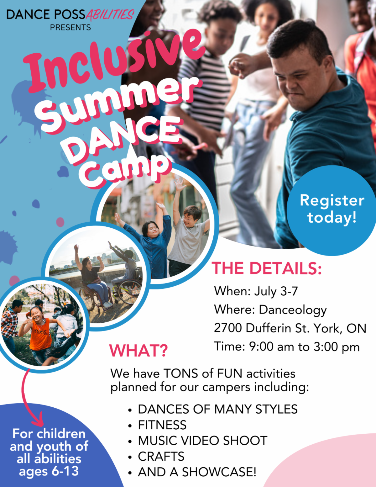 Child and youth of all abilities ages 6 – 13 are welcome to dance, exercise, play, and HAVE FUN at Dance PossAbilities' Inclusive Summer Dance Camp this July. Learn more and register at the button below.
