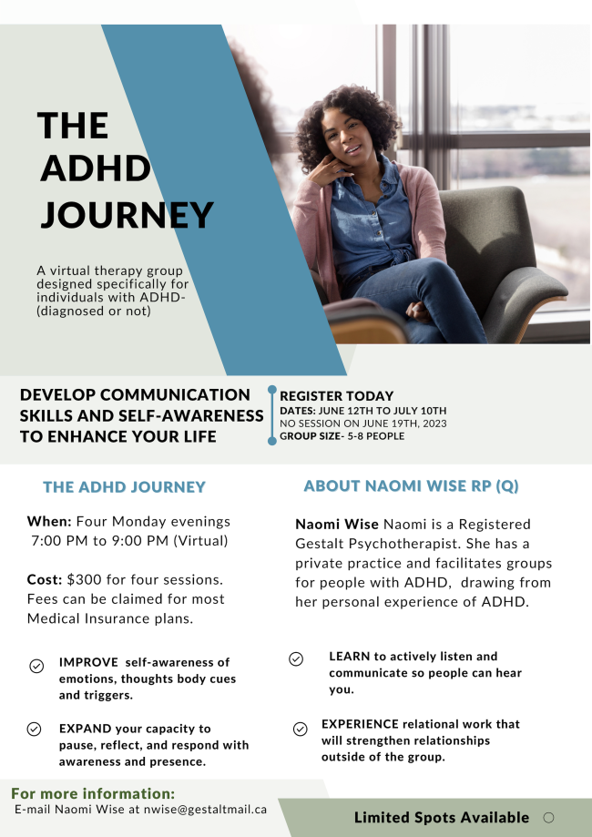 Join Registered Gestalt Psychotherapist Naomi Wise for a 4-session virtual support group this month. Email Naomi at the button below to learn more and register.