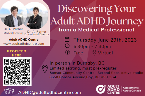 Dr. Gurdeep Parhar, Medical Director and Dr. Anita Parhar, Educational Director from the Adult ADHD Centre will be hosting a live and virtual Adult ADHD educational discussion on Thursday June 29th, 2023. Live event to be streamed for virtual viewers. The live event will be held in Burnaby, British Columbia.