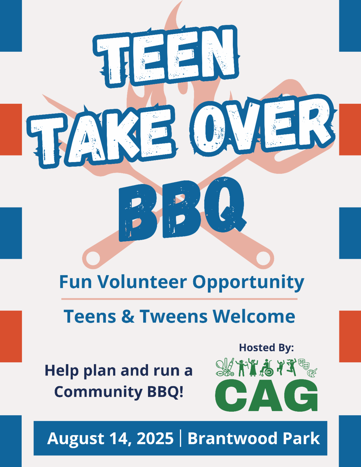 Our teen/tween volunteers will help run the event on August 14, and can also sign up to help plan the BBQ in advance, with guidance and support from CAG staff and adult volunteers.