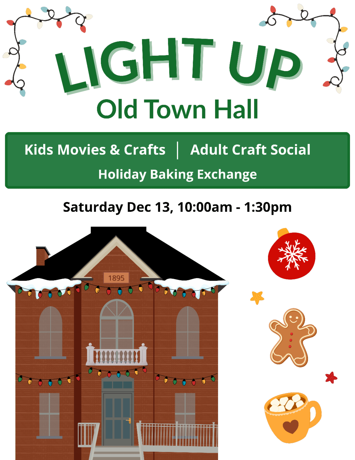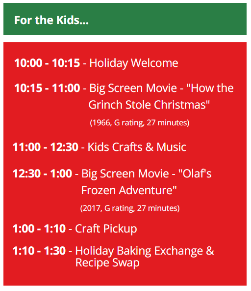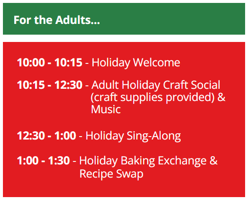 With activities for children and adults alike, everyone is welcome, no registration required! Kid's holiday movies and crafts will take place upstairs, and an adult craft social and holiday baking exchange will take place downstairs.