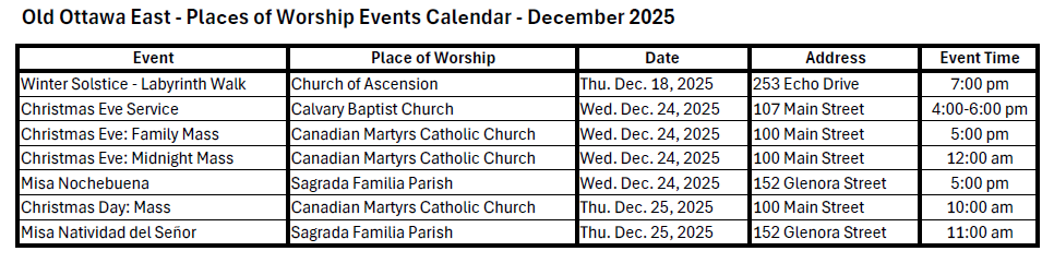 | | External links are provided as a convenience and for informational purposes only; they do not constitute an endorsement or approval by the Community Activities Group of Old Ottawa East of any of the subsequent products, services or opinions. The Community Activities Group of Old Ottawa East bears no responsibility for the accuracy, legality or content of the external site or for that of subsequent links. | | Stay up to date by following us on social media: | |