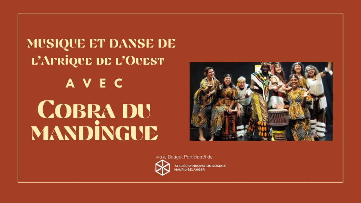 Venez célébrer la musique et la danse de l’Afrique de l’Ouest avec Cobra du Mandingue. Cette troupe de l’Outaouais fondée en 2009 regroupe des artistes d’Afrique, du Québec et de l’Ontario, qui nous feront découvrir des rythmes et percussions inspirés de la culture guinéenne. Venez apprendre quelques pas de danse avec Mohamed et la troupe de Cobra!
