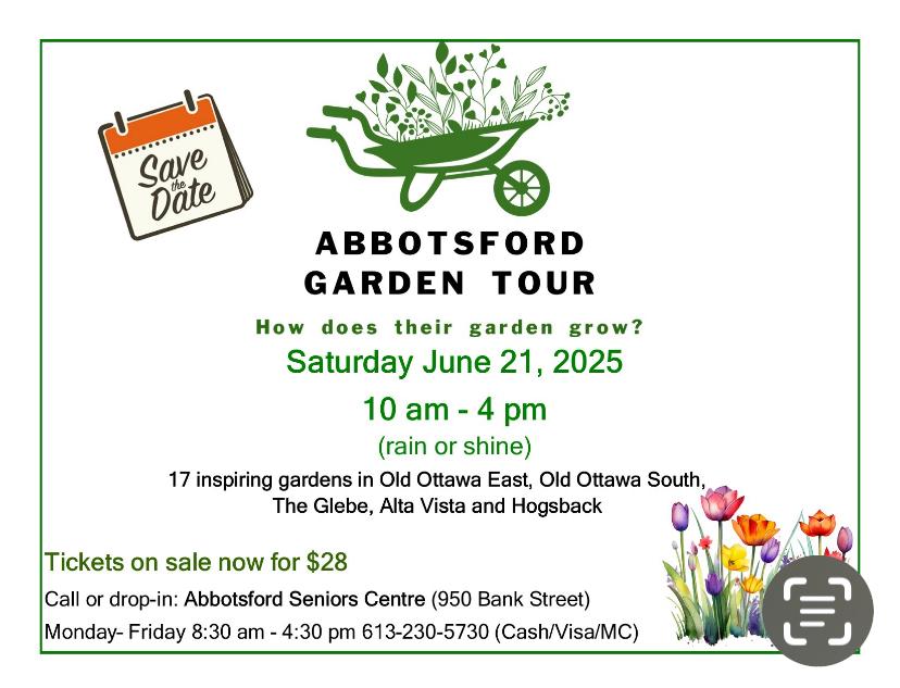 | | The 2025 Abbotsford Garden tour will take place on Saturday June 21, 2025 from 10:00am to 4:00pm. Tour 17 inspiring gardens in Old Ottawa East, Old Ottawa South, The Glebe, Alta Vista and Hogsback! | | |