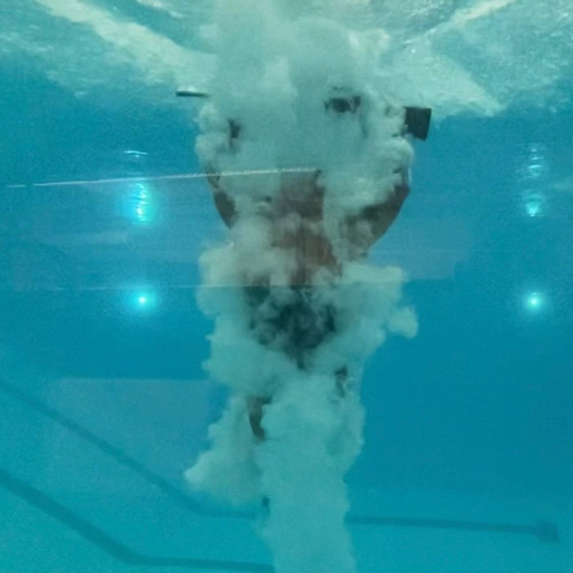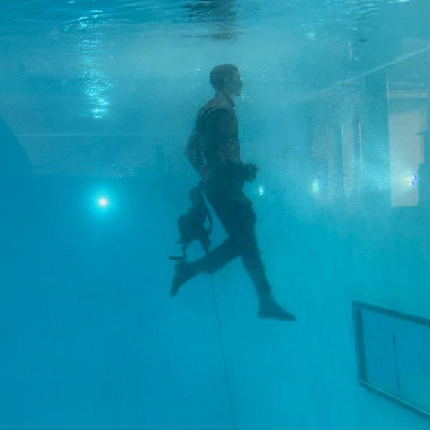 CDT Miller performing the Gear Ditch exercise. Cadets jump in from the side of the pool and learn to ditch their gear and get back to the surface. |