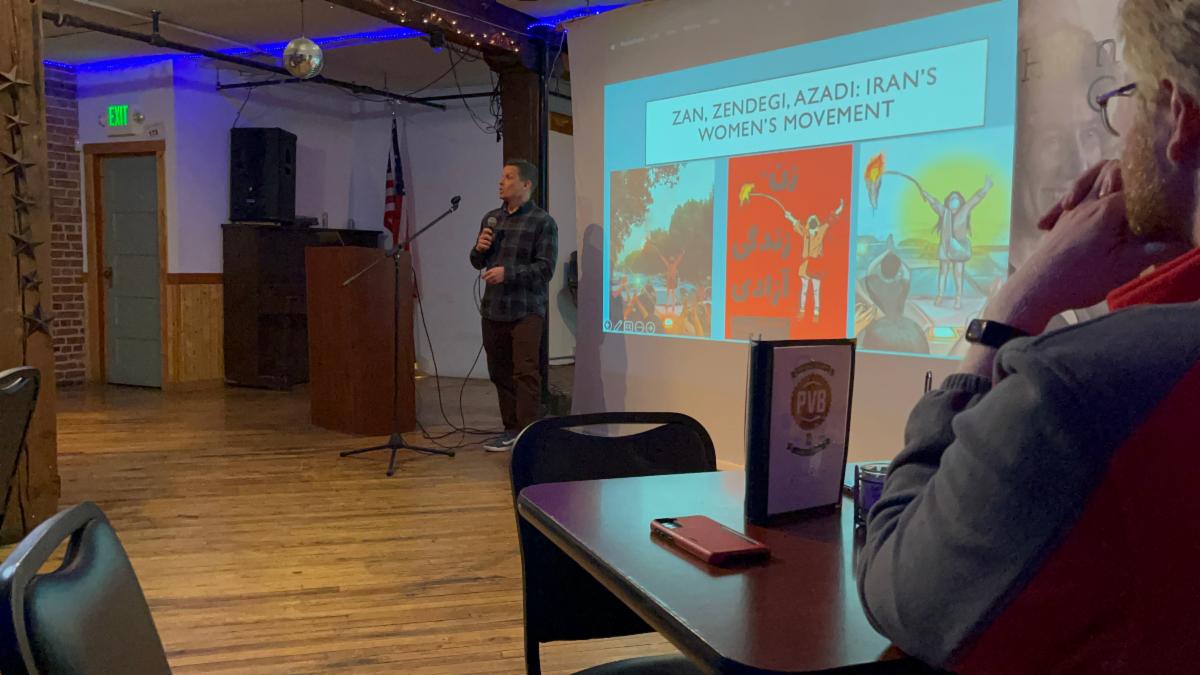 Both professors talked about the power and influence of the visual medium, particularly video, in protest movements. Heern talked about how women are at the heart of the movement in Iran as he shared videos and images of protests and protest art.