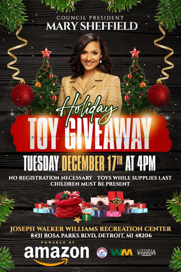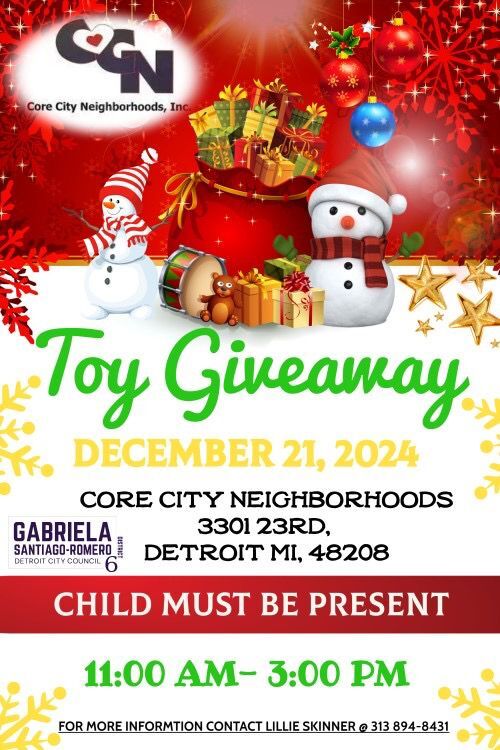 December 21 at 11am, a Toy Giveaway will be taking place at Core City Neighborhoods. Child must be present. For more information contact Lillie Skinner at (313)894-8431. | |