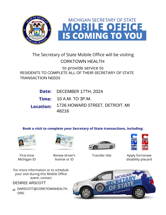 December 17th at 10am, the Secretary of State Mobile Office will be visiting Corktown Health to provide services to residents to complete all of their Secretary of State transaction needs.