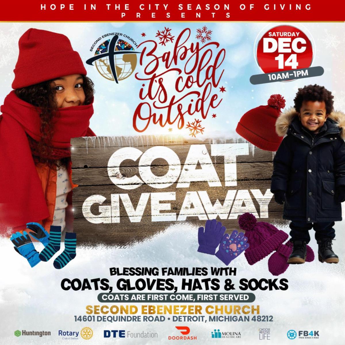 Join Second Ebenezer Church for a Coat Giveaway on Saturday, December 14th from 10am to 1pm.