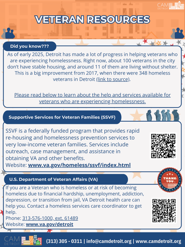 If you are experiencing homelessness and need to get help, the process begins with contacting CAM (313) 305-0311.