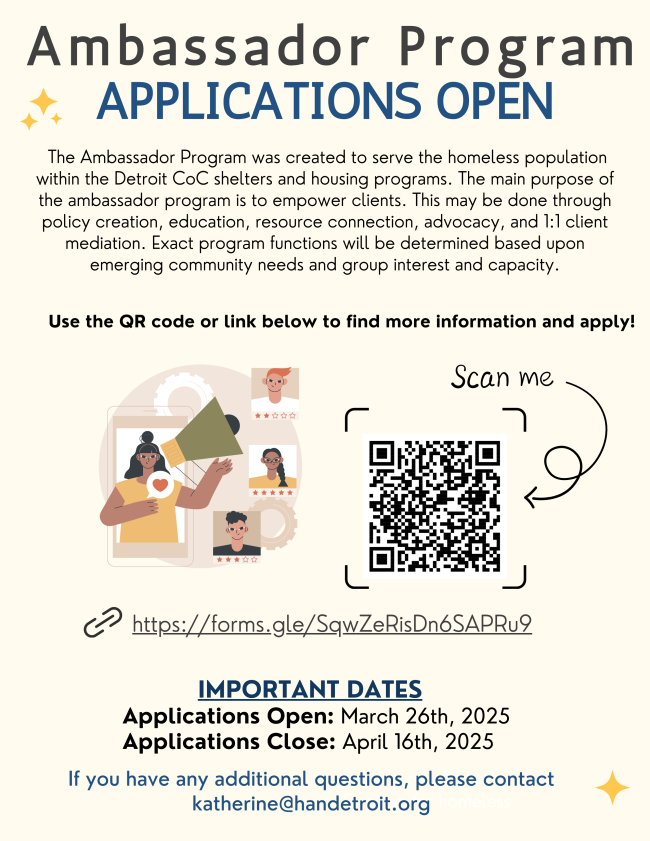 | Ambassador Program Applications Open | | | | The Ambassador Program was created to serve the homeless population within the Detroit CoC shelters and housing programs. The main purpose of the ambassador program is to empower clients. This may be done through policy creation, education, resource connection, advocacy, and 1:1 client mediation. Exact program functions will be determined based upon emerging community needs and group interest and capacity. | | City of Detroit 7-Point Plan Issued | | |
