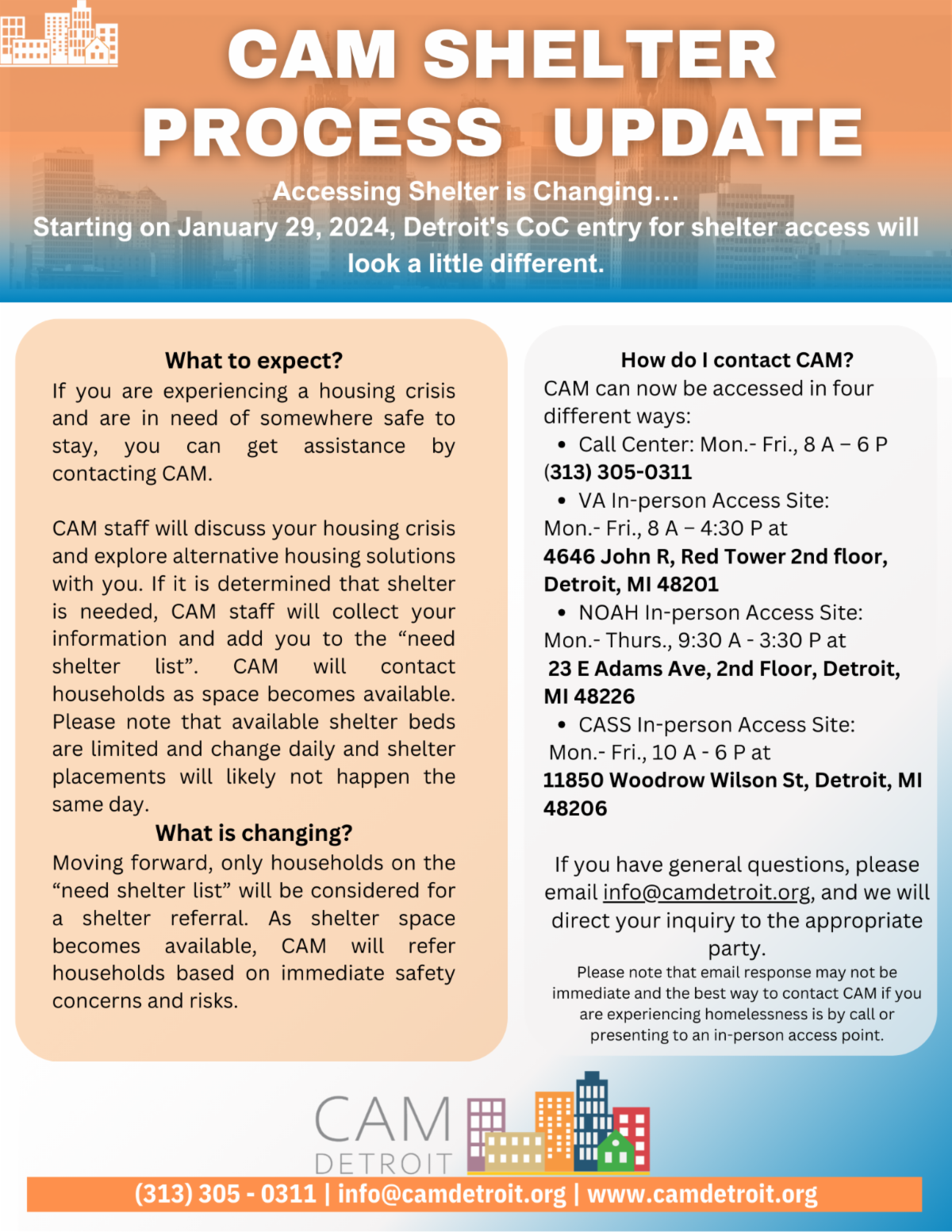 If you are experiencing homelessness and need to get help, the process begins with contacting CAM (313) 305-0311.