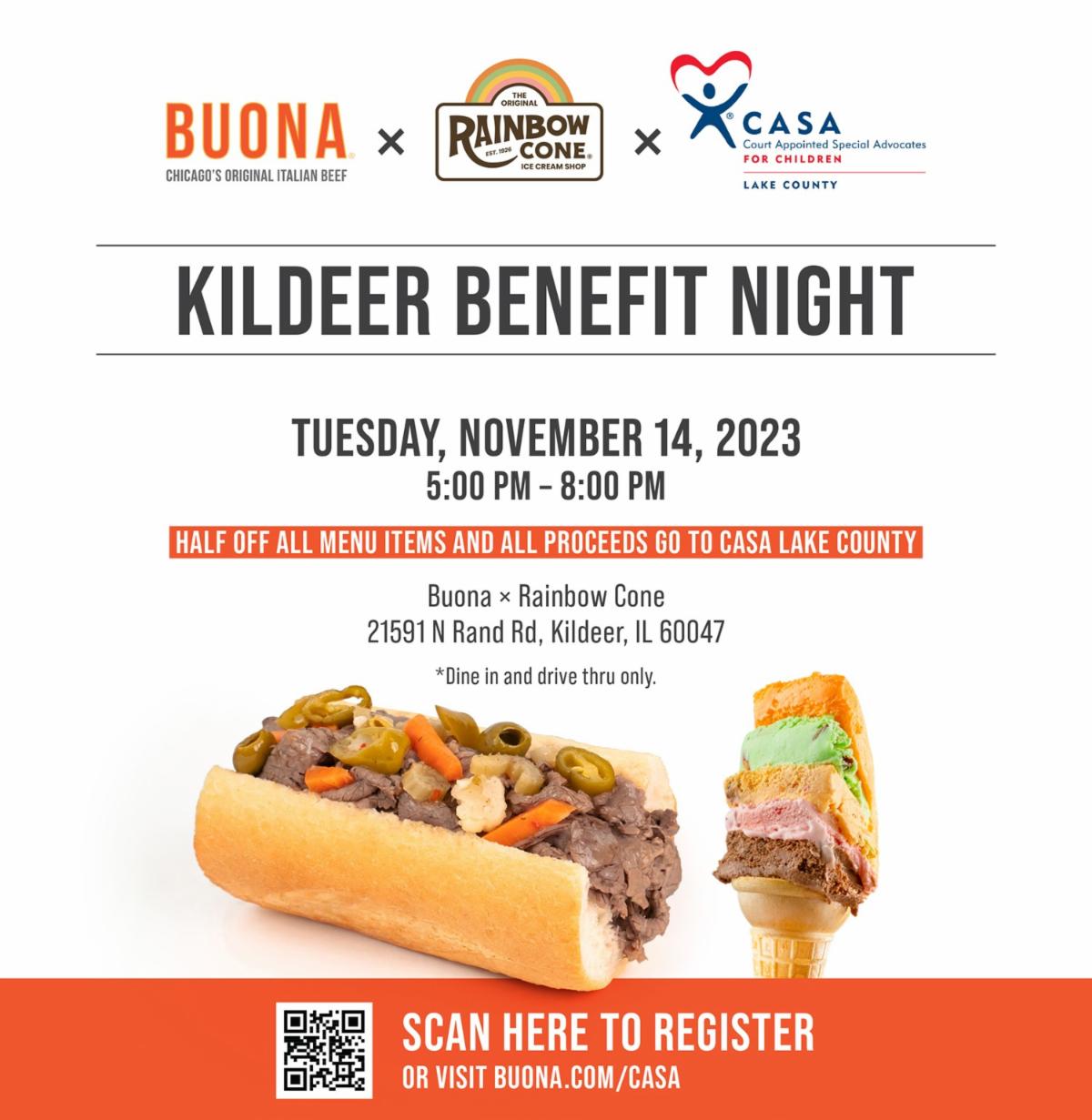 Buona x Rainbow Cone is partnering with CASA Lake County for the soft-opening night of their new Kildeer store on Tuesday, November 14th between 5-8pm. During this time, all menu items will be half-off, and all proceeds will be donated to CASA.