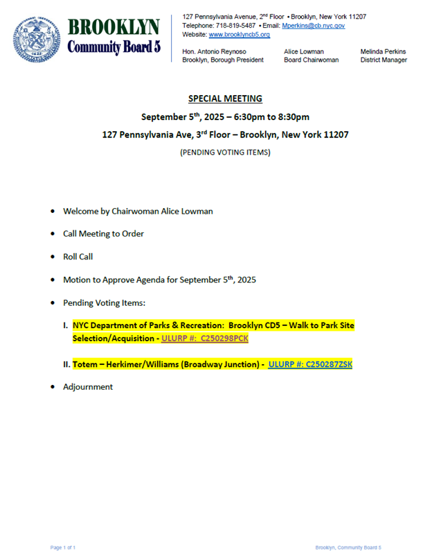 Brooklyn CB5 will be holding a Special Meeting on September 5th, at 6:30pm to submit the Full Board vote on the following projects: