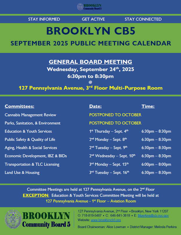 Community Board 5 | 127 Pennsylvania Avenue 2nd Floor | Brooklyn, NY 11207 US