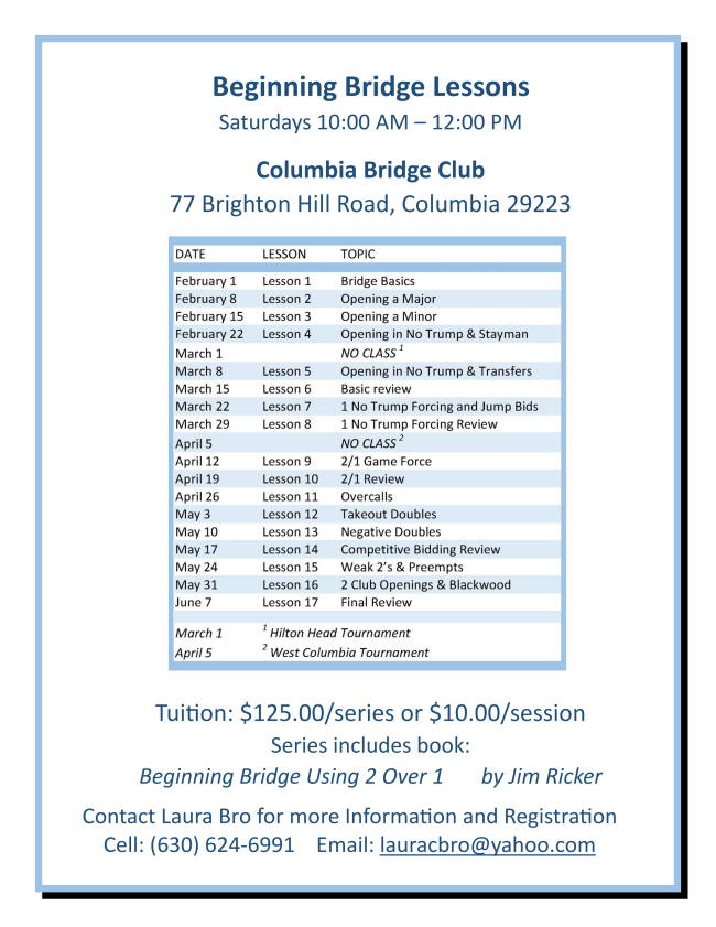 Columbia Bridge Club | 77 Brighton Hill Road www.bridgewebs.com/columbiabridgeclub | Columbia, SC 29223 US