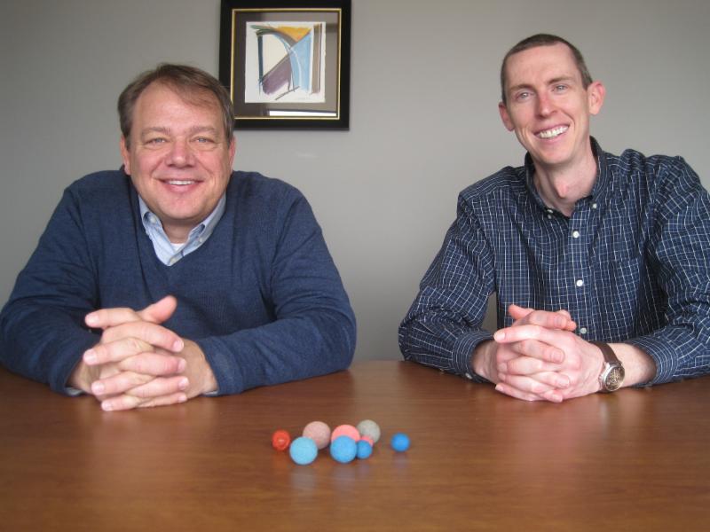 Mike Crocker and Chuck Dirks display a pile of brightly colored spongy balls resembling the Nerf balls children play with, as they discuss their plans to make them "smarter."