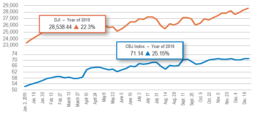 Closer to home, the weekly CBJ Stock Index, a basket of publicly traded companies with a significant presence in the Corridor, gained 25.15% on the year, driven by a broad surge in financial and manufacturing stocks. Fifteen of the index’s 22 components registered gains of 20% or more during the year, with only four companies losing ground.
