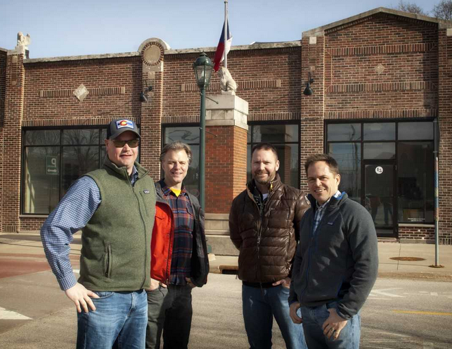 Soko Outfitters founders (l-r), Steve White, Steve Shriver, Graig Kone and Dr. Ryan Sundermann, shown in front of the location where the store will open this summer. PHOTO ANDREA SHRIVER