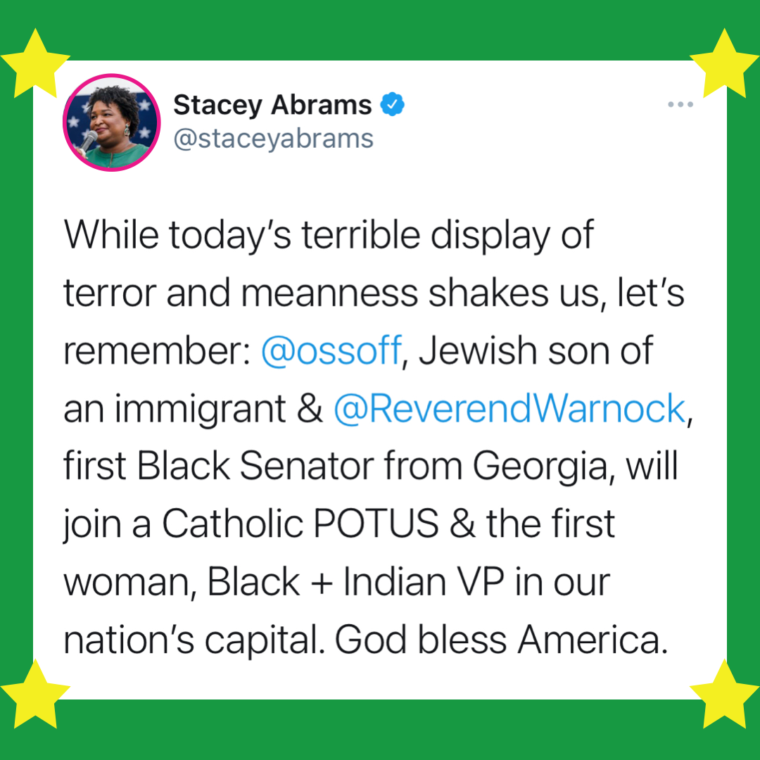 Mazal Tov to Jon Ossoff, the first Jewish person elected senator in Georgia, and to Rev. Raphael Warnock, the first Black person elected senator in Georgia, and the first Black Democrat ever elected to the Senate in the South, on their historic victories!
