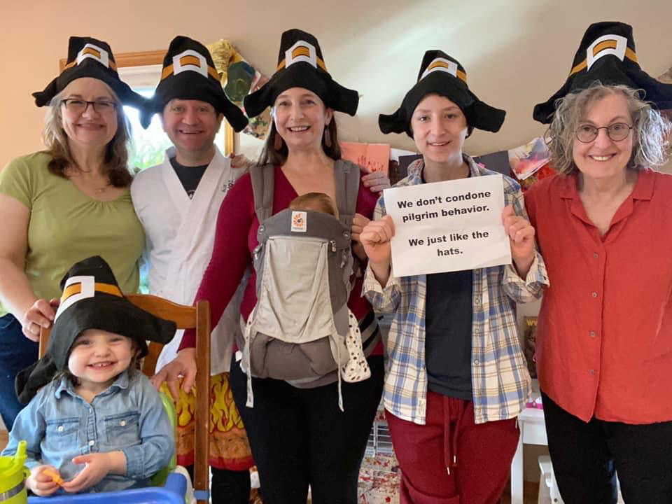 CBST members Aari Ludvigsen (end left) and Barbara Gaines (end right) celebrate Thanksgiving with their family, with help from some fierce Pilgrim fashion.