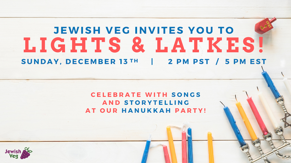Celebrate with songs and storytelling at the Jewish Veg Hanukkah party! Bring your hanukkiah and your vegan latkes and gather around our virtual table for a bright and festive evening.