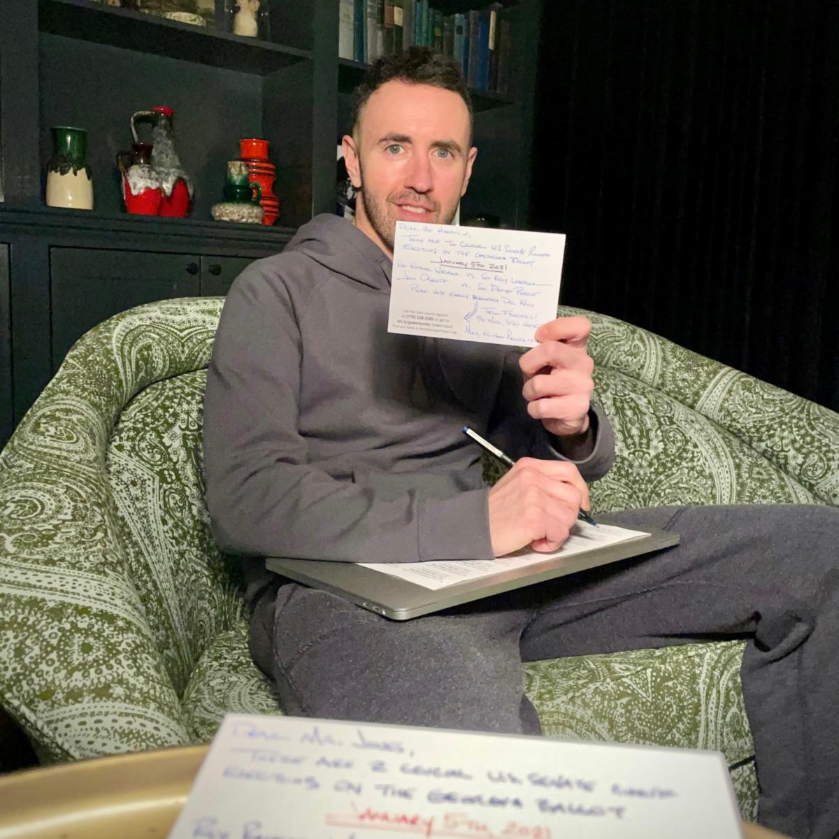 Mark Meyerhoff wrote postcards to Georgia voters, reminding them to get out and vote on January 5, 2021, for the two open US Senate seats from that state, which will determine the majority and minority parties in the Senate. "Exciting stuff for someone who's never done this before," Mark said. "Loved doing it!" Know anyone who lives in Georgia? Encourage them to vote on January 5!