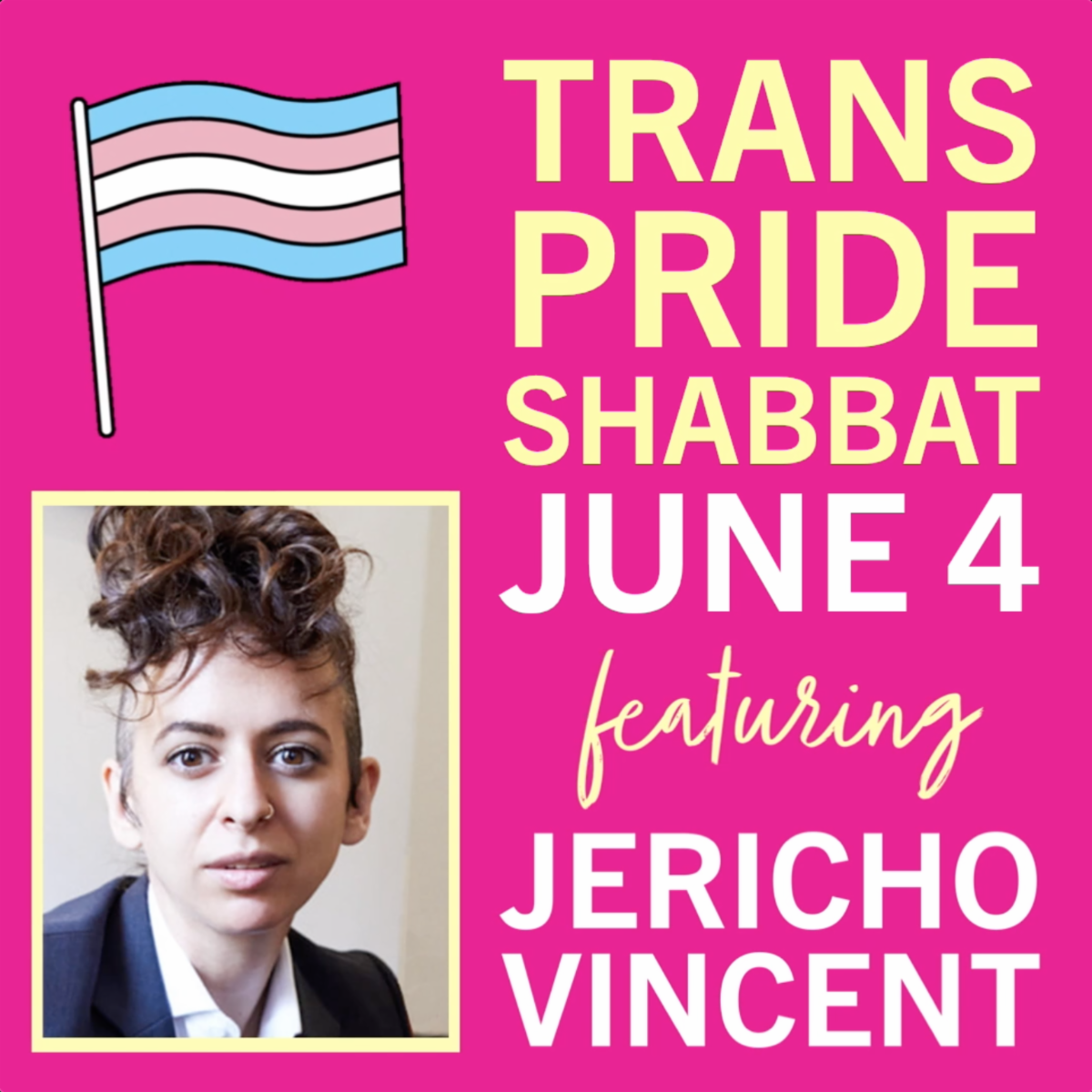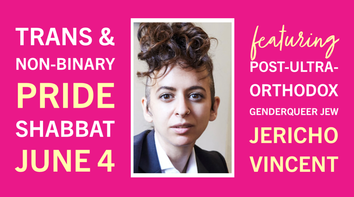 Our guest speaker for Trans & Non-Binary Pride Shabbat is Jericho Vincent, a post-ultra-Orthodox genderqueer Jew. A Wexner fellow who is currently studying for the rabbinate, they hold a master's degree in public policy from Harvard University. For their activism, Jericho has been named to the Jewish Week's 36 Under 36 and the Forward's Forward 50. Jericho's writing has appeared in The New York Times, Salon, and The Cut, and they are the author of the memoir Cut Me Loose.