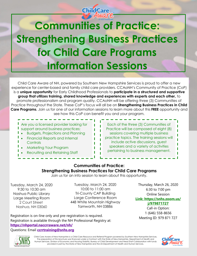Communities of Practice: Strengthening Business Practices for Early Childhood Programs. During the information sessions, you will learn about this new opportunity, how it can benefit you and your program and how to participate. See below for more details.