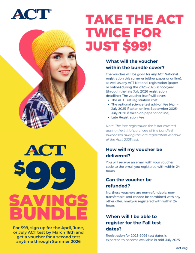 Now through March 16, students that sign up for the April, June, or July ACT will have the opportunity to select a bundle for $99 and get a voucher for a second test anytime through Summer 2026.