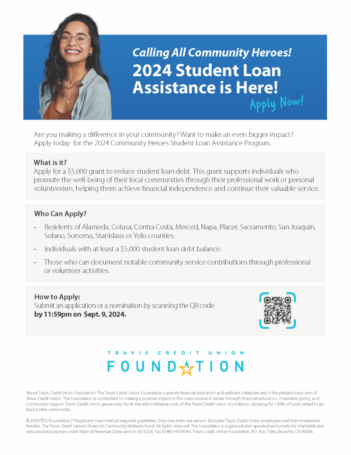 The Travis Credit Union Foundation’s Community Heroes $5000 Student Loan Assistance Grant closes on September 9, 2024.