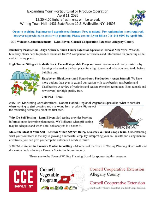 The Southwest New York Dairy, Livestock and Field Crops Program with Cornell Cooperative Extension offers educational programming and research based information to agricultural producers, growers, and agribusinesses in the five county region of Southwestern New York.