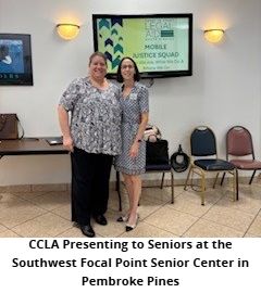Since our last update, CCLA continued our community outreach throughout Broward County. Our dedicated Senior Law Unit Attorneys presented to a group of seniors at the Southwest Focal Point Senior Center in Pembroke Pines. The session focused on raising awareness about the wide range of legal services available through our Senior Citizen Law Project and our Mobile Justice Squad, both of which are committed to safeguarding the rights and well-being of older adults in our community. During the presentation, our attorneys provided valuable insights on how seniors can protect themselves from becoming victims of scams, fraud, financial exploitation, and various forms of abuse.