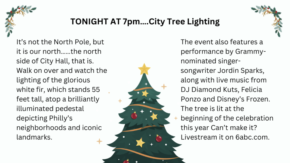 Come to Rittenhouse Square at 5 pm to enjoy refreshments, music, giveaways, the illumination of the holiday lights and – you guessed it -- a guest appearance from Santa.
