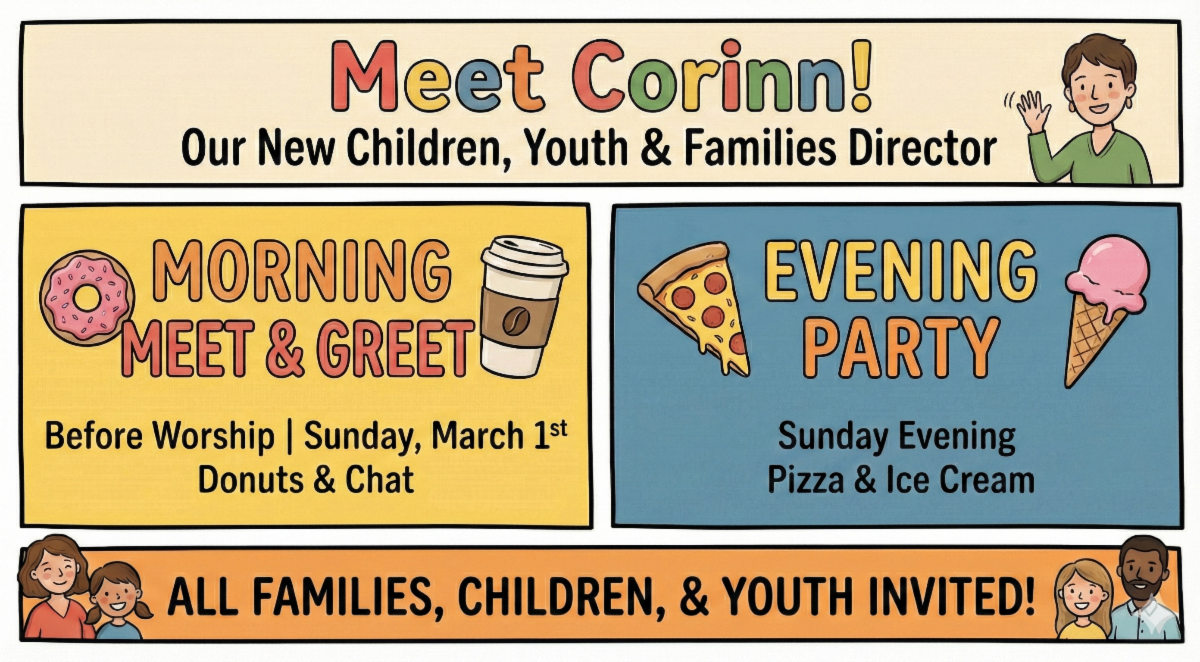 After more than a year of searching, I am delighted to share that we have found our new Children, Youth, and Families Director, and she is exactly who we hoped for. Please join me in welcoming Corinn Morrison to the CCSM family! Corinn brings over two decades of experience working with kids and families in multilingual, multicultural settings right here in the Bay Area. She starts this Sunday, March 1st. Drop her a welcome email at corinn@ccsm-ucc.org, or greet her at Happy Coffee Hour after our 10:30am or 4:00pm services this week. Families, children, and youth: see below for special opportunities to meet her that day!